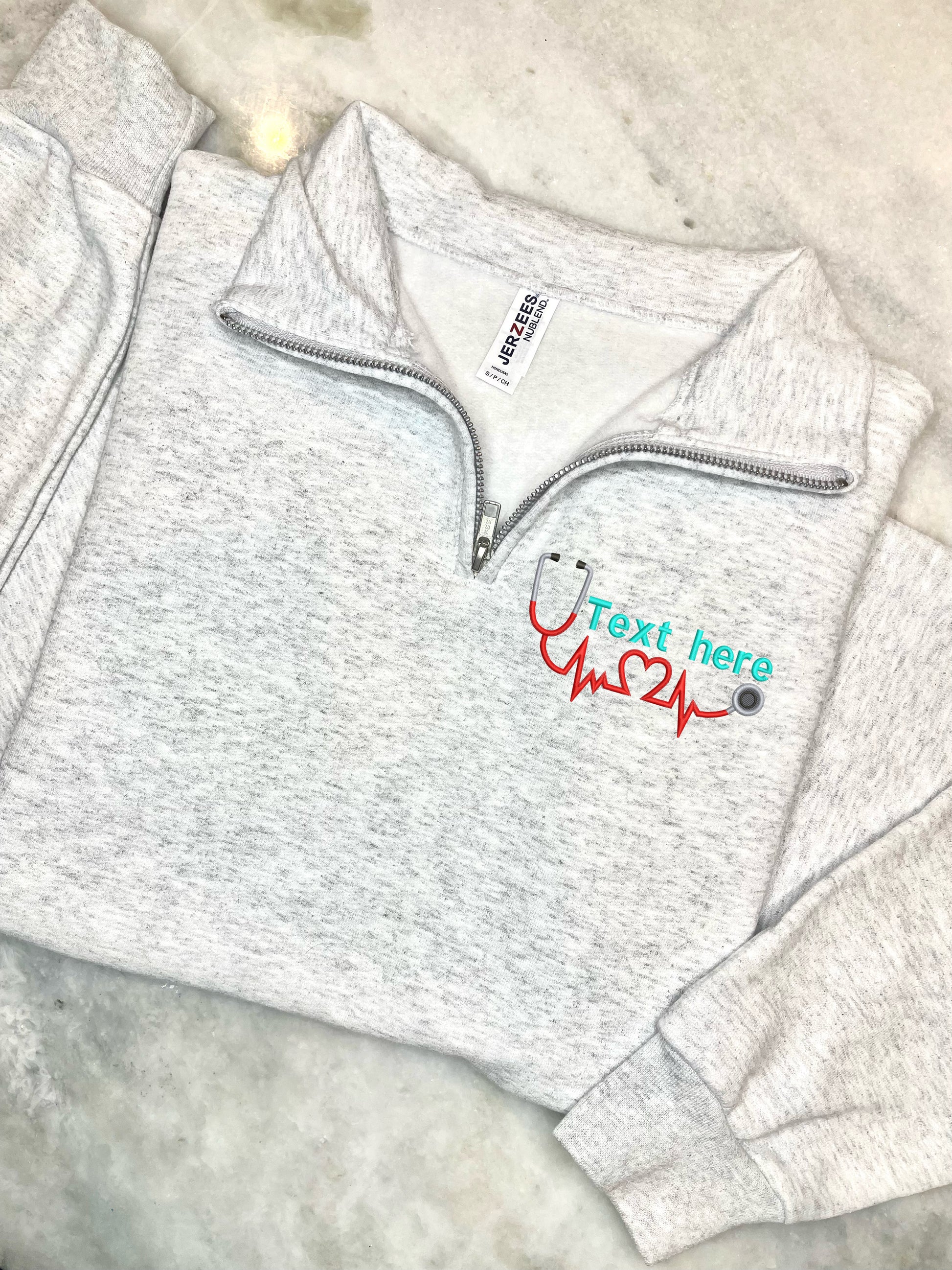 "YOUR TEXT" is your name it can also be any credentials like RN, BSN. You can choose cursive or regular font as well as your own thread choices. Thread colors can be any color for your text. Example: Navy Font, White Font, Pink Font, Yellow Font. Just let me know what color you'd like. These are a unisex half Zip jacket.